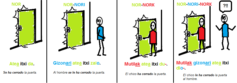 Un error muy frecuente que cometen los castellanoparlantes a la hora de hablar euskera es confundir el NOR–NORK y el NOR–NORI–NORK. Pero se debe tener clara una premisa: que en castellano sea “a quién” no significa que en euskera tenga que ser “nori”.