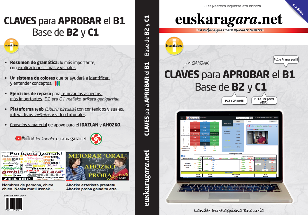 El Libro Físico tiene el 100% del B1 (equivalente al 80% del B2 y 70% del C1), y se completa con el Liburu Birtuala. Ahí tienes el 100% de todos los niveles, B1, B2 y C1. Es uno de los libros mas innovadores y tiene buena aceptación -va por la 4ª edición-, ya que en los euskaltegi o centros de estudio suelen funcionar generalmente con fotocopias. Los alumnos requieren de un material que les resuma lo mas importante, con esquemas y consejos de cara al azterketa.