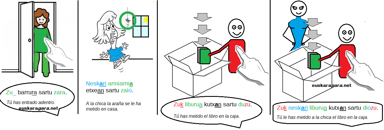 Algunos conceptos de gramática pueden ser un poco complicados de entender. Sobre todo en euskera, ya que la sintaxis es diferente. El orden de las frases es diferente respecto a las lenguas romance (portugués, español, francés, italiano, rumano…) y anglosajonas, es decir, los mas cercanos al entorno de Euskal Herria. Pero hoy en día, un libro puede explicarte con flechas, colores, cuadros, diferentes tipos de letra… con los que puedas distinguir las estructuras y aprendas razonando, en vez de memorizandolo sin más. Es mucho mas eficiente, sobre todo si eres adulto, y quieres “entender“, para interiorizar y aprender mas rápido.