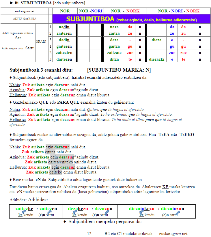 B2 eta C1 mailan, subjuntiboan, NOR, NOR–NORK eta NOR–NORI–NORK aditz sistemak (zutabeak) dira erabilienak.